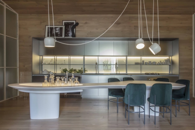Ao entrar no espaço, o visitante se depara com o espaço de jantar, que segue a já clássica receita de integrar cozinha ao estar. Uma bancada única de cinco metros concentra o local de preparo das refeições, enquanto uma mesa cumpre dupla função: comer e beber. Arrematando a composição, de um lado, ficam as cadeiras de jantar assinadas por Etel Carmona e, do outro, um pequeno espaço para o bar.