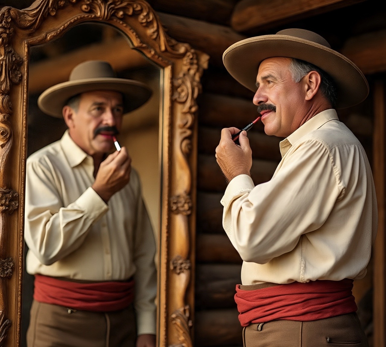 Vestiu a cueca, a bombacha e uma camisa branca. Colocou um par de meias e calçou as botas, de couro flexível, iam quase até o joelho. Passou o cinto pela bombacha e apertou bem. Amarrou o lenço no pescoço. Azul, que era gremista doente, não usava vermelho de jeito nenhum. Pegou a guaiaca, nela levava algum dinheiro, o celular e o cartão de crédito. Por último, pôs o colete, o paletó e o chapéu. Só descartou o facão, aí já era demais.