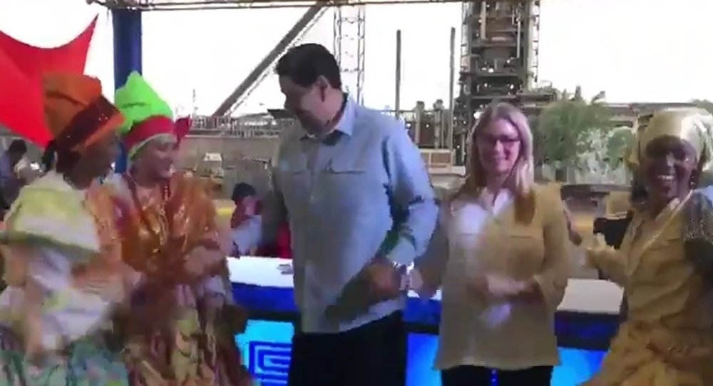 O presidente venezuelano, Nicolas Maduro, e sua esposa, Celia Flores, dançaram canções dedicadas a ele em uma reunião com representantes das empresas de mineração. O líder venezuelano pediu aos músicos que estavam presentes no encontro para tocar para o público em homenagem ao carnaval. Os músicos tocaram uma salsa cujas principais palavras foram “Maduro não sai, Maduro não sai”. Ouvindo a música, o presidente e sua esposa realizaram vários movimentos de dança, cercados por dançarinos vestidos com trajes típicos.