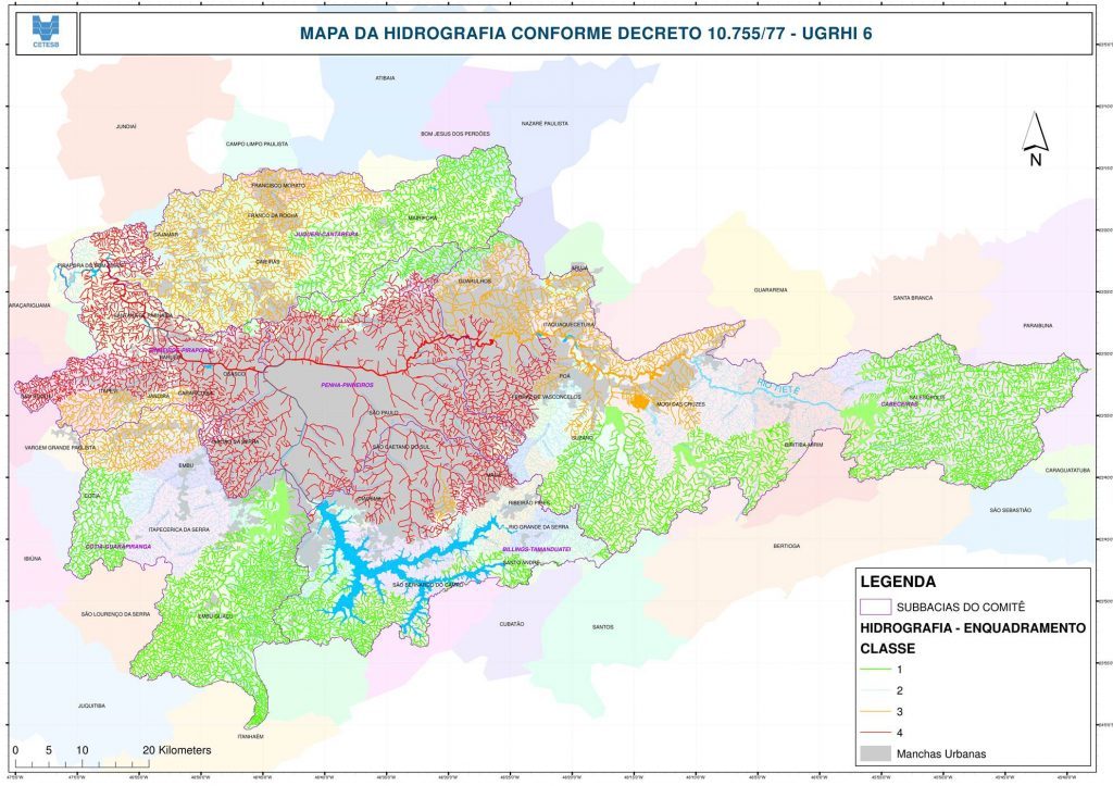 Em outras palavras, o enquadramento é uma bússola que aponta para onde e em quais condições a sociedade deseja que seus rios “naveguem”. O fato de termos rios totalmente poluídos e aceitarmos o enquadramento de classe 4 é um indicador ruim. Entretanto, esse quadro pode ser alterado com o interesse e a pressão da sociedade, com Comitês de Bacia fortes e com quadro técnico capacitado e com a participação de políticos responsáveis que se mostrem preocupados com nossas águas. Podemos alterar o mapa apresentado nesse texto de modo que não haja mais nenhum traço vermelho, com uma forte tendência para o verde.