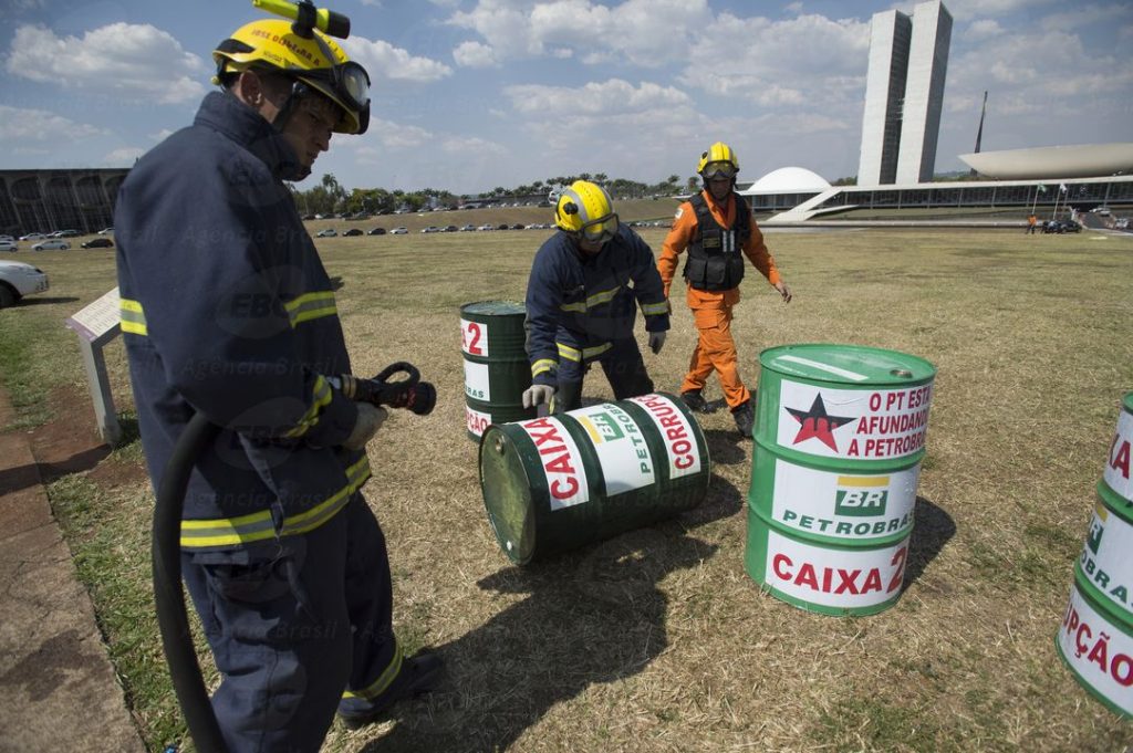 Nas laterais de cada um dos quatro barris, havia frases contra atos de corrupção, caixa 2 em campanhas e protestos diretos contra o atual governo com os dizeres como “O PT está afundando a Petrobras”.