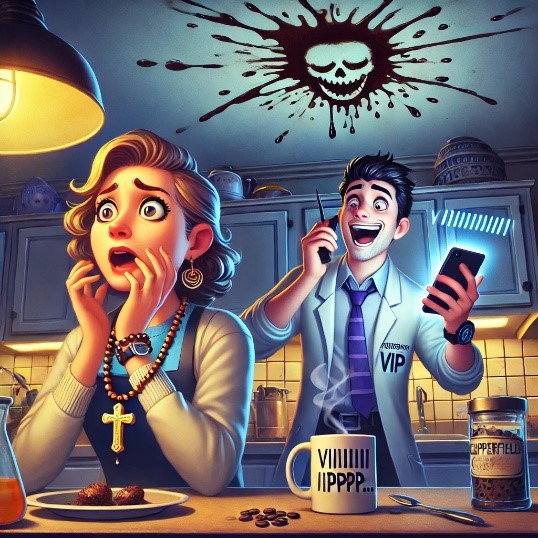 Na manhã seguinte, a delegada Dra. VIP chegou nervosa, com um crucifixo no pescoço e segurando um terço no bolso do terno, pronta para qualquer manifestação do além.