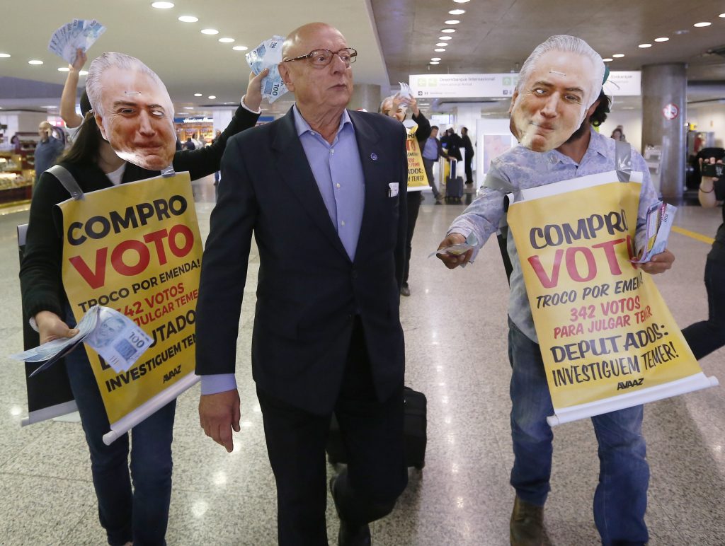 Usando máscaras com o rosto de Temer e placas com os dizeres “Compro Voto – Troco por emenda”, os ativistas abordavam os passageiros que chegavam à capital federal, distribuindo notas falsas de R$ 100.