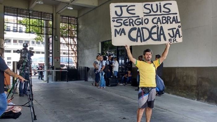 A prisão do ex-governador Sérgio Cabral (PMDB) atraiu manifestantes para a porta da Superintendência da Polícia Federal, na zona portuária do Rio de Janeiro. O desempregado Edson Rosa, de 47 anos, figura conhecida da jornada de protestos de junho de 2013, levou seus cartazes para a PF. “Je suis Sérgio Cabral na cadeia já”, diz uma das inscrições. “Ele é culpado dessa quebradeira do Rio, é o culpado de tudo”, disse o manifestante, que chegou a participar das ocupações na porta da casa da casa do ex-governador em 2013.