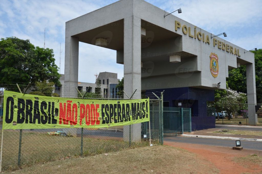 Entre 15 e 20 pessoas participaram de ato em apoio à Polícia Federal, ao juiz Sérgio Moro e à Operação Lava Jato, neste sábado (17), em Brasília, em frente a sede da Polícia Federal. O grupo, formado por diversos movimentos que compõem o Vem Pra Rua, enfeitou a entrada do prédio com balões e faixas, além de usar um megafone para falar palavras de ordem aos motoristas que passavam por perto.