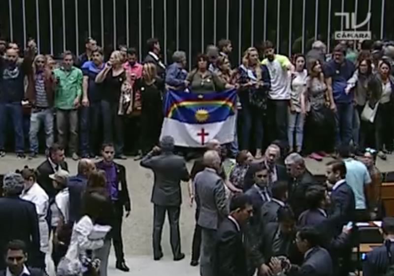 Enquanto o grupo estava no plenário da Casa, o deputado Darcísio Perondi (PMDB-RS), criticou os manifestantes e pediu respeito à democracia.