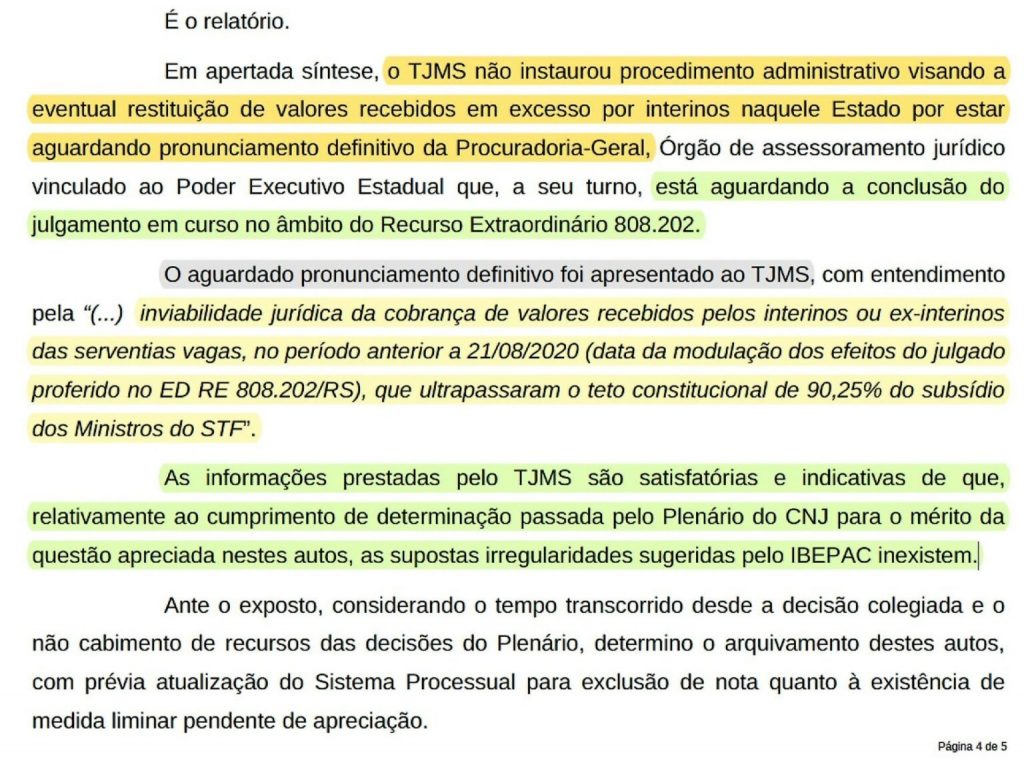 Em apertada síntese, o TJMS não instaurou procedimento administrativo visando a eventual restituição de valores recebidos em excesso por interinos naquele Estado por estar aguardando pronunciamento definitivo da Procuradoria-Geral, Órgão de assessoramento jurídico vinculado ao Poder Executivo Estadual que, a seu turno, está aguardando a conclusão do julgamento em curso no âmbito do Recurso Extraordinário 808.202. O aguardado pronunciamento definitivo foi apresentado ao TJMS, com entendimento pela “(…) inviabilidade jurídica da cobrança de valores recebidos pelos interinos ou ex-interinos das serventias vagas, no período anterior a 21/08/2020 (data da modulação dos efeitos do julgado proferido no ED RE 808.202/RS), que ultrapassaram o teto constitucional de 90,25% do subsídio dos Ministros do STF”.
