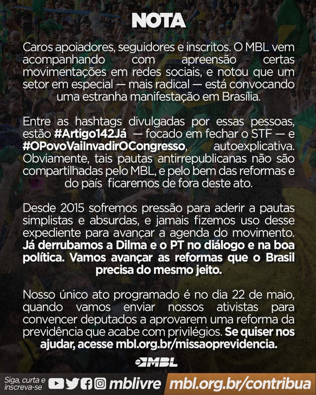 O MBL considera que os temas da convocação do movimento são radicais, se considerados as hashtags #Artigo142Já e #OPovoVaiInvadirOCongresso.