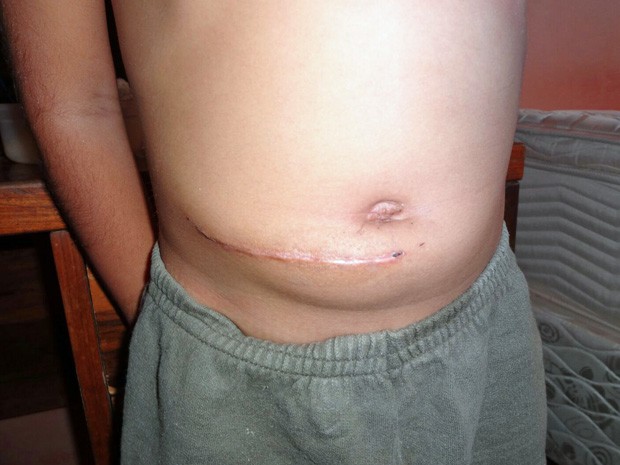 Por causa do erro no diagnóstico inicial, o garoto teve de passar por duas cirurgias – uma de emergência, para a retirada do apêndice, e outra para limpeza de órgãos. Ele ficou com uma cicatriz de 11 centímetros na barriga.