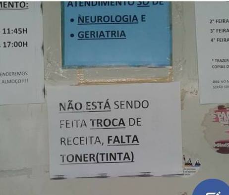 “Assim não dá”. Essa foi a reação de Eunice Oliveira, moradora do Gama, ao saber que não seria atendida por um médico no Hospital Regional daquela satélite porque não havia tonner para imprimir uma eventual receita de medicamentos. Inconformada, Eunice despachou um zap-zap para Notibras, anexando o ‘aviso’ para todo paciente ler. Se o problema fosse só o tonner…