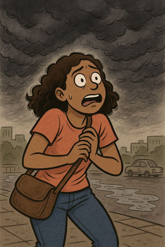 Mas o meu medo… o meu medo é de chuva. Isso mesmo. Chuva. Aquele fenômeno natural, essencial pra vida na Terra, que faz as plantinhas crescerem e as poças se multiplicarem. Eu sei que parece estranho. Eu mesma fico surpresa, às vezes. Mas, é só o céu escurecer, e eu já começo a avaliar rotas de fuga, pontos de abrigo, pensar se tem lona em casa, se o sapato é antiderrapante, se já fiz testamento.