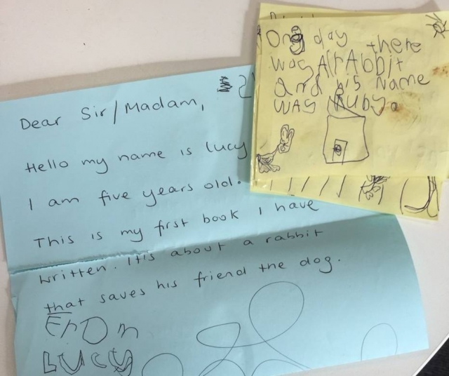 Ela mora em New South Wales e enviou sua obra lúdica com uma carta que dizia: “Olá, meu nome é Lucy. Eu tenho cinco anos de idade. Este é o meu primeiro livro que escrevi. É sobre um coelho que salva seu amigo, o cachorro”.
