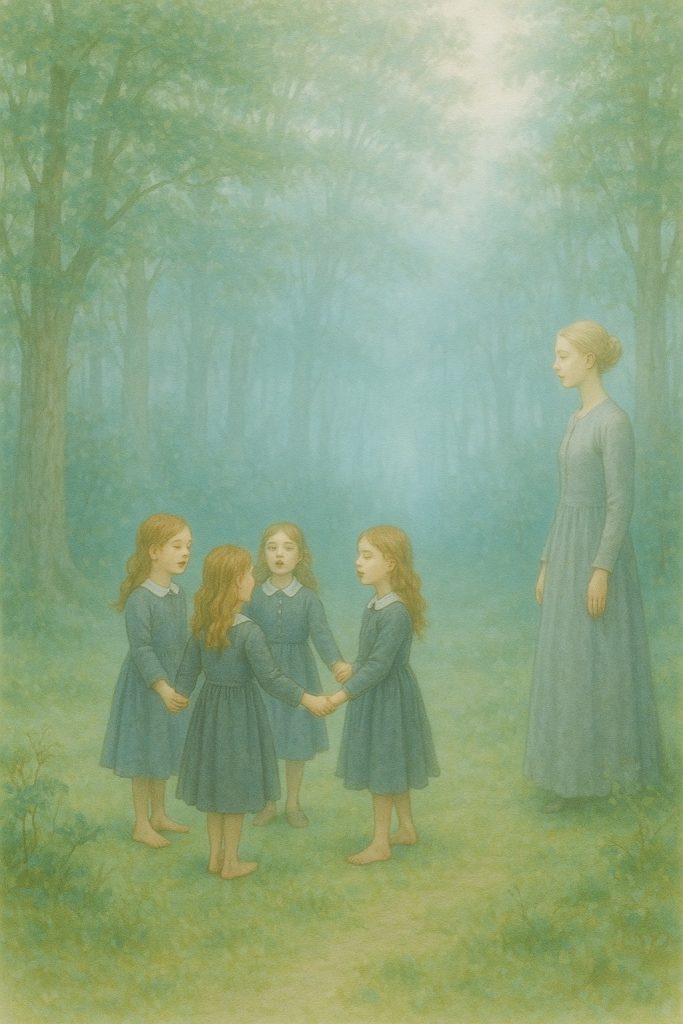 Ia chegando perto, até o ponto em que se estaciona, e reparei que, em meio à solidão da floresta, eu não estava só. Um grupo de meninas, vestidas do que me pareceu um uniforme escolar muito antiquado, brincavam por ali, cantando em roda, de mãos dadas, uma antiquíssima cantiga.