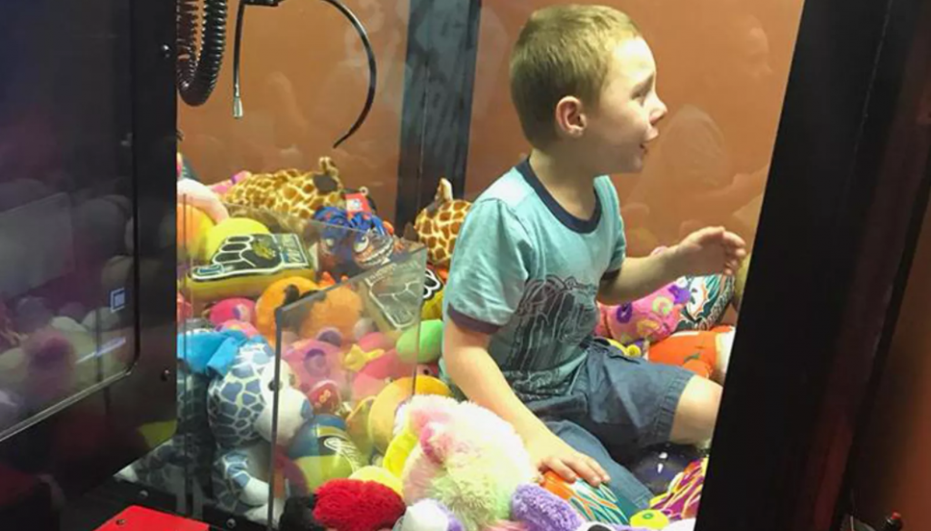 O pequeno Mason estava jantando no local e, aparentemente, decidiu que queria um bicho de pelúcia. Ele então subiu na máquina de pescar os brinquedos e, por uma abertura, entrou nela, não conseguindo mais sair.