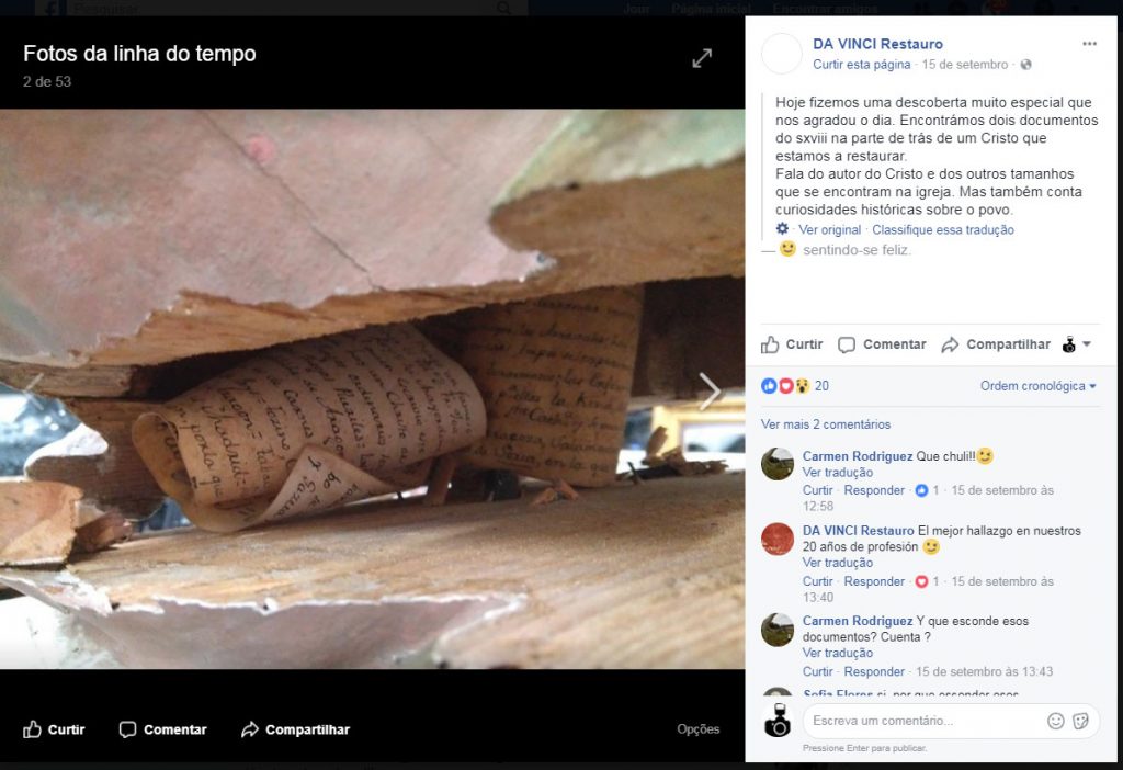 “Hoje fizemos um achado muito especial, que alegrou o nosso dia. Encontramos dois documentos do século 18 na região traseira de um Cristo que estamos restaurando. (A mensagem) fala do autor do Cristo e do restante das esculturas que estão na igreja. Mas também conta curiosidades históricas referentes ao povoado”, postou a Da Vinci Restauro em sua página no Facebook.