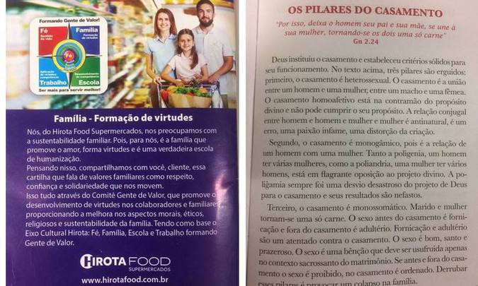 O Hirota Food Supermercados virou alvo de críticas nas redes sociais após distribuir panfletos defendendo o conceito de casamento composto apenas por homem e mulher e chamando a união homoafetiva de “distorção”.