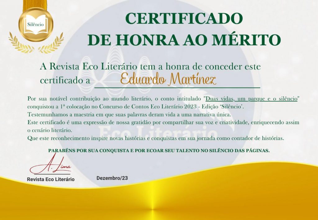 Eduardo Martínez, colaborador de Notibras, mês sim, outro também, é premiado por suas crônicas e contos. A mais recente comenda acaba de ser outorgada pela revista Eco Literário. Corresponde a uma medalha de ouro por ‘sua notável contribuição ao mundo literário’, diz o comitê de premiação. Dudu é mestre com suas palavras, dando vida a narrativas únicas’. Notibras fica honrado em ter Eduardo Martínez em nossos quadros. Os prêmios individuais, a gente mostra. Os coletivos, nós mantemos nas paredes da redação para que sejam vistos por todos os que nos visitam.
