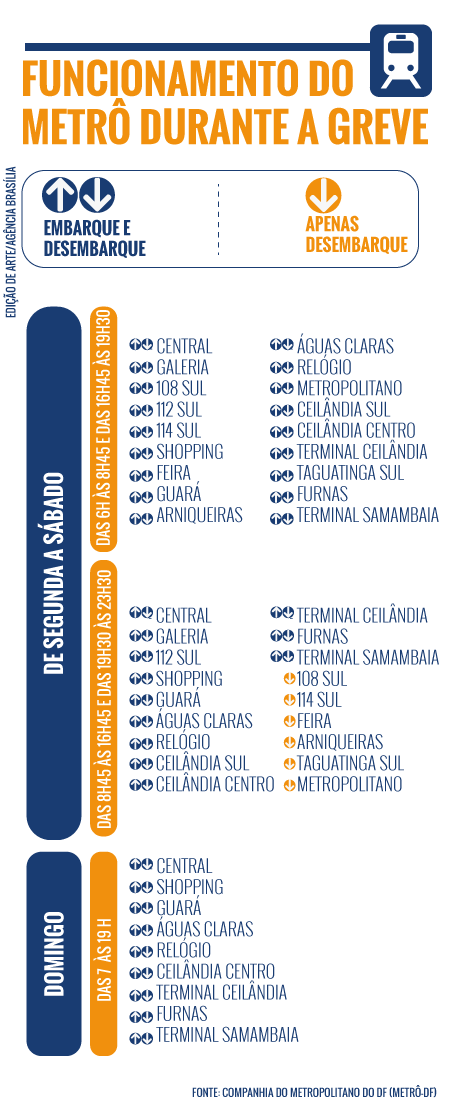 De acordo com a Companhia do Metropolitano, as estações 102 Sul, Asa Sul, Concessionárias, Guariroba, Ceilândia Norte e Samambaia Sul permanecerão fechadas durante todo o período de greve.