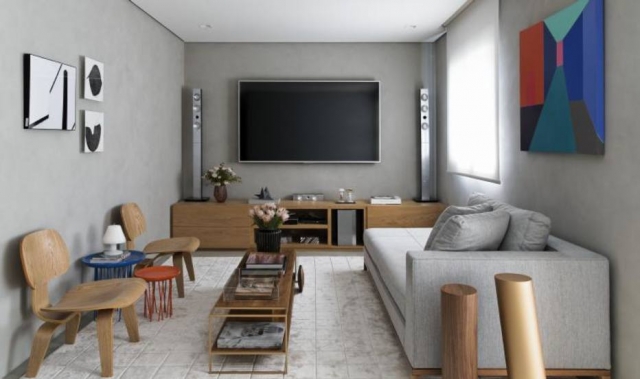 Resolvida a questão, como preservar a unidade do projeto nos demais itens como móveis e acessórios? “Continuar com o cinza”, dispara Fernanda, que aplicou a mesma cor também nos estofados, deixando pontos em cores mais intensas a cargo das obras de arte e dos detalhes da decoração, que ganharam tons entre o nude e o azul claro.