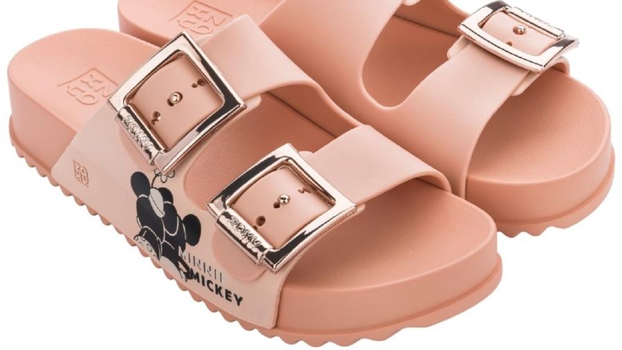 Já o segundo slide da coleção tem uma silhueta do Mickey estampado na palmilha e um maxi laço na parte frontal em referência à Minnie. O modelo está disponível nas cores preto, branco, vermelho, rosa claro e rose pelo preço sugerido de R$ 59,99.