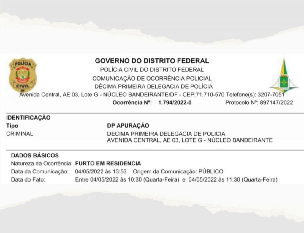 2) a ocorrência policial foi registrada pelo delegado aposentado às 13h53 do dia 4 de maio de 2022, na 11ª Delegacia de Polícia Civil do Núcleo Bandeirante, que apura crimes na região do Park Way;
