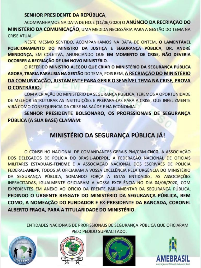 Os congressistas receberam apoio das entidades que congregam as categorias de policiais e bombeiros militares por meio de documento encaminhado ao Palácio do Planalto, onde cobram ‘Ministério da Segurança Pública Já’. É preciso estar atento, afirmam militares, pois a pós-pandemia trará crises sociais.