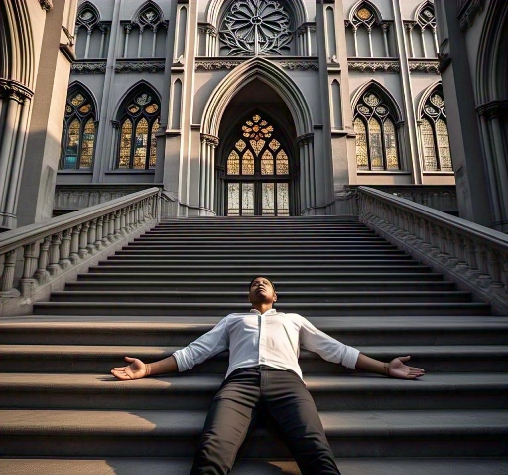 Enquanto isso, lá aos pés da escadaria, o “cadáver” abriu um olho, bocejou e, coçando a barriga, perguntou: