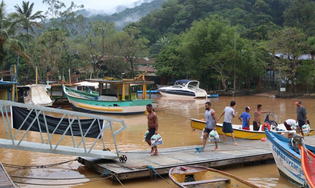 Moradores de Boiçucanga, bairro fortemente afetado pelo temporal do fim de semana em São Sebastião, no litoral norte paulista, estão sem água para beber. Para garantir o abastecimento da população, a associação de pescadores local se organizou para transportar garrafas de água até a comunidade.