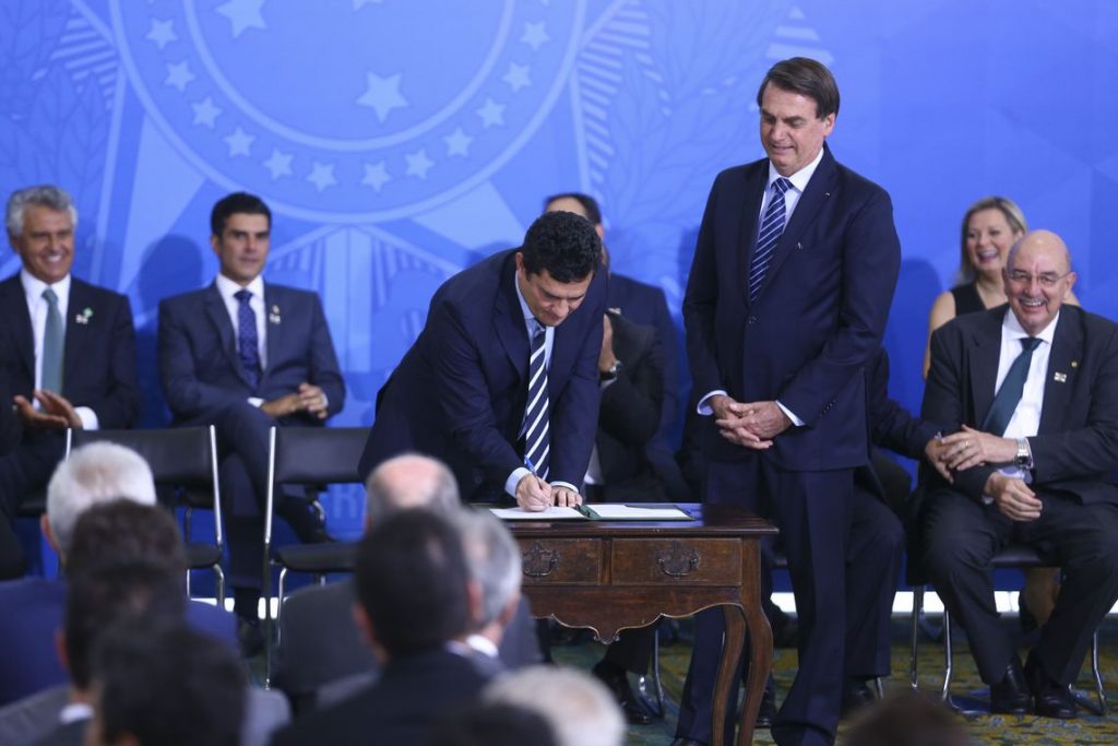 “Se Deus quiser, vai dar certo esse plano-piloto, montado pelo Ministério da Justiça e Segurança [Pública], tendo à frente o senhor Sergio Moro, que é um patrimônio nacional”, disse o presidente. “Obrigado, Sergio Moro, que vossa senhoria abriu mão de 22 anos de magistratura para, não entrar numa aventura, mas sim na certeza que todos nós juntos podemos sim fazer melhor para nossa pátria”, frisou Bolsonaro em meio a aplausos da platéia.