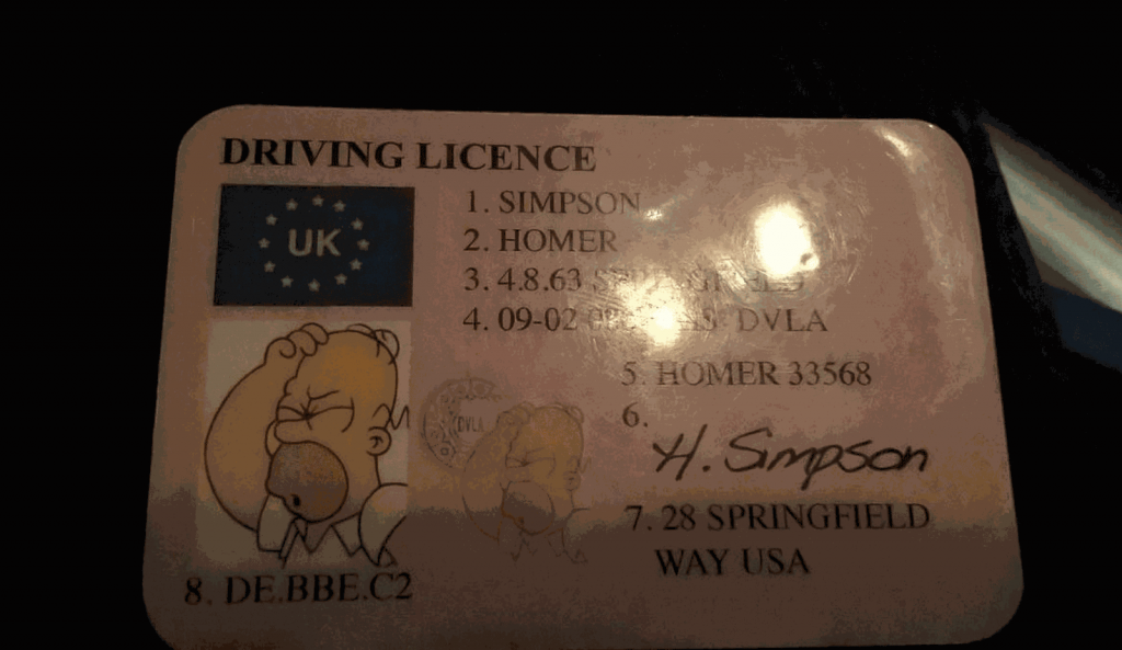 Um motorista parado pela polícia no condado inglês de Buckinghamshire mostrou uma carteira de motorista de mentira em nome do personagem de desenho animado Homer J. Simpson.