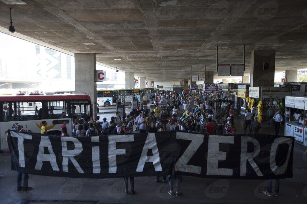 Integrantes do Movimento Passe Livre (MPL) fizeram mais um ato em defesa da passagem de ônibus grátis. Cerca de 30 integrantes e apoiadores do movimento se reuniram na Rodoviária do Plano Piloto, no centro da capital federal e a poucos quilômetros do Estádio Mané Garrincha, onde apresentaram aos usuários do transporte público que passavam pelo local suas propostas de como viabilizar a chamada tarifa zero.