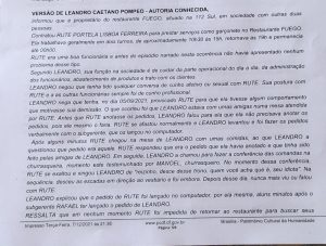 Rute conta reservadamente – embora não conste no depoimento à polícia -, que Leandro dizia ‘imoralidades’ no ouvido dela, “chegando mesmo a abraçar-me pela cintura após elogios estranhos”. Na delegacia, Leandro negou as acusações. E garantiu que sempre dispensou aos seus funcionários um tratamento cordial e respeitoso. Trechos dos dois primeiros depoimentos podem ser lidos nas reproduções enxertadas neste texto.