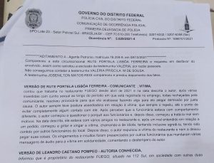 Feita a ocorrência policial inicial na 1ª DP, na Asa Sul, foram ouvidos num primeiro momento Rute Lisbôa, neta da Vovozinha que vivia dias tranquilos em sua casinha na floresta, e Leandro Caetano Pompeo, que revezaria momentos entre garanhão e lobo-guará no luxuoso Lago Sul, bairro nobre de Brasília. As versões dos dois são contraditórias, segundo cópias dos depoimentos a que Notibras teve acesso. Outras testemunhas estão sendo ouvidas e mais outras são esperadas pelo delegado e pelo escrivão.