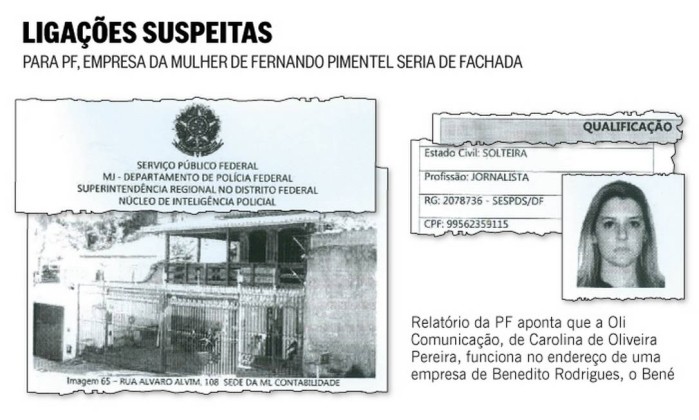 A Oli Comunicação e Imagens, que está em nome de Carolina, seria sido usada pelo grupo de Benedito de Oliveira, o Bené, para movimentação financeira indevida. Bené foi preso na sexta-feira. Ele atrua no mercado gráfico e tem fortes ligações com Pimentel.