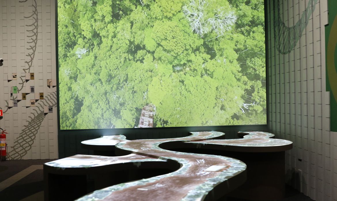 Em mais um esquema interativo, sentado ao redor da caracterização de uma sumaúma, considerada uma das maiores árvores da Amazônia, o visitante verá como vivem as comunidades que habitam a floresta, como os agricultores, os extrativistas e os ribeirinhos. A viagem continua por um balcão sinuoso que remete a um rio com três afluentes. Cada um deles representa um fator que coloca em risco a preservação do bioma. Um vídeo projetado no local mostra a expansão das pastagens e a construção de grandes obras de infraestrutura.
