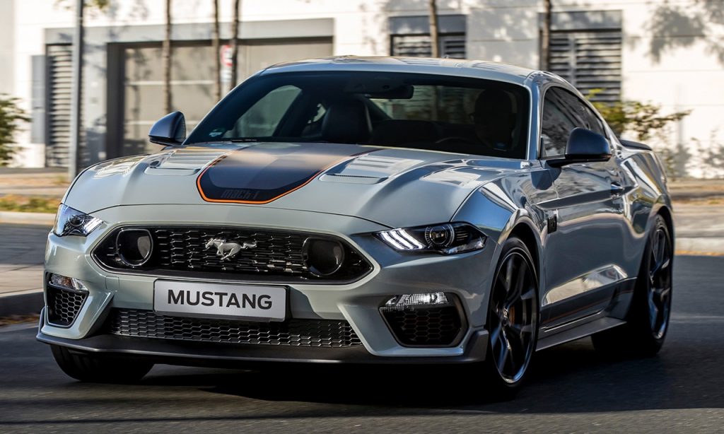 Os faróis com iluminação full LED dão um ar ainda mais carrancudo ao cupê. Da mesma forma, a traseira curta tem lanternas em tom branco, aerofólio e o emblema Mach 1 ao centro. As rodas de 19″ de alumínio em tom cinza brilhante completam o visual.