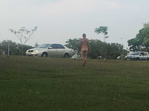 Imagens feitas por uma pedagoga mostram um homem andando completamente nu perto do Zoológico de Brasília. As fotos foram feitas no final da tarde de segunda-feira (28), próximo de uma faculdade particular, de dentro do carro. Não há informações sobre a possível prisão do adepto de Adão.