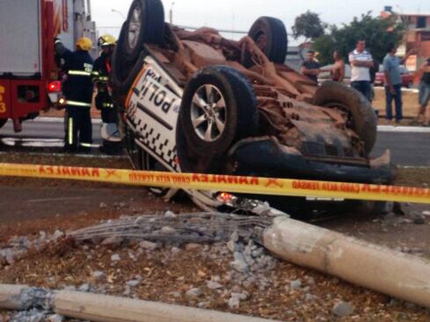 Uma viatura da Polícia Militar que ia socorrer colegas em Santa Maria, bateu em um poste após capotar na avenida Alagados, às 5h50 deste sábado (17).