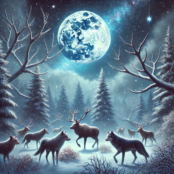 No Natal, renas fogem de lobos para transportar Papai Noel e os presentes