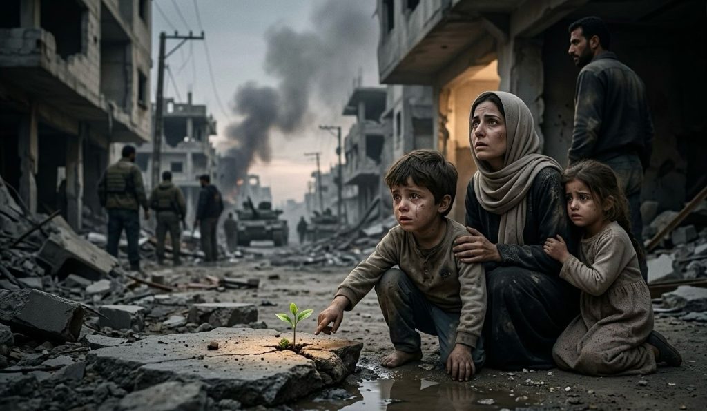 Crianças veem a destruição sombria
