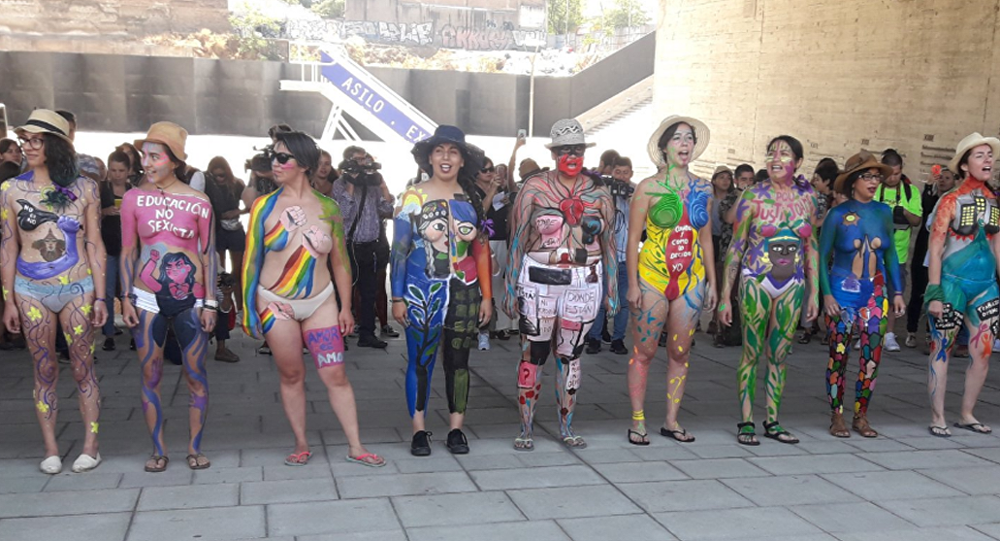Desfilando pelas ruas da cidade com apenas tinta corporal para preservar suas partes íntimas, as manifestantes também cobriram as paredes das estações do metrô com nomes masculinos, cartazes de conhecidos artistas chilenos e nomes de mulheres vítimas de violência de gênero.