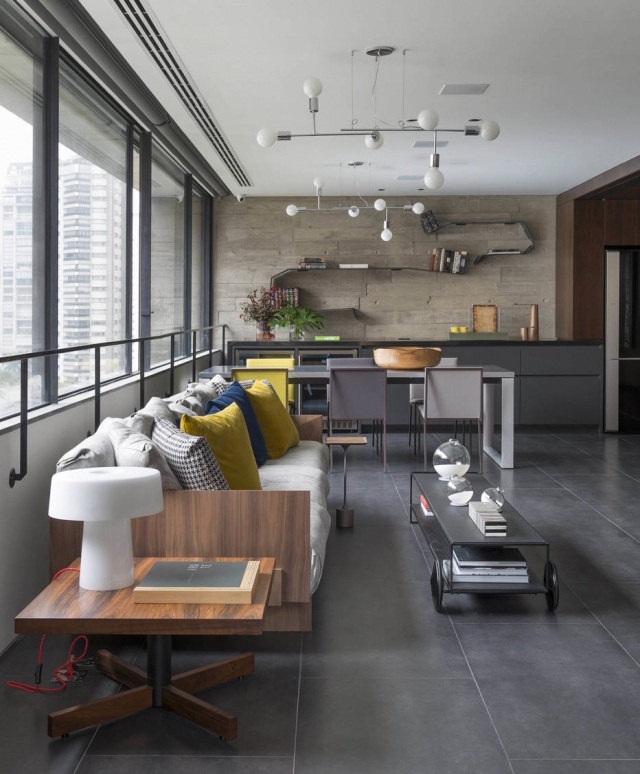 Ponto alto da decoração, um painel de madeira ipê tabaco abraça o projeto na área social. Como o porcelanato escolhido para o piso também tem um tom escuro, a arquiteta usou azul e amarelo para quebrar a monotonia.