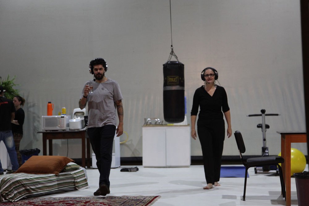 O novo trabalho teve primeiro experimento no ano passado, no Festival Arte Porto Alegre, com os atores Pingo Alabarce e Vika Schabbach (foto). No palco, a dupla recebeu um “kit sobrevivência” com banheiro químico, uma cozinha, mesa, cadeiras, sofá e colchão. Há também aparelhos de academia como um saco de pancada, bicicleta e halteres.