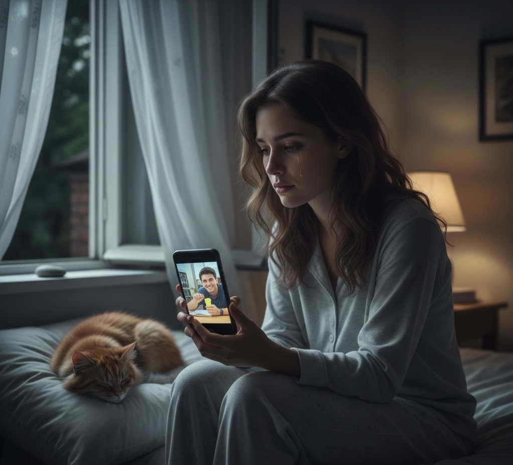 Meses depois, as pessoas perguntavam se ela estava bem. Mariana sorria e dizia que sim. Arrumou o cabelo, voltou a sair com as amigas, adotou um gato que dorme no travesseiro que era do Lucas. Mas às vezes, no silêncio da madrugada, ela pega o celular antigo, abre as fotos e deixa uma lágrima cair sem barulho.