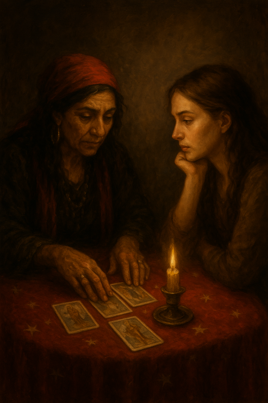 A mesa era coberta por um pano vermelho, bordado de estrelas douradas que cintilavam à luz bruxuleante da vela. Do outro lado, sentava-se a consulente, mãos trêmulas, coração acelerado. Queria saber o que o amanhã lhe guardava, como se o destino coubesse em um baralho gasto de cartas marcadas pelo tempo.