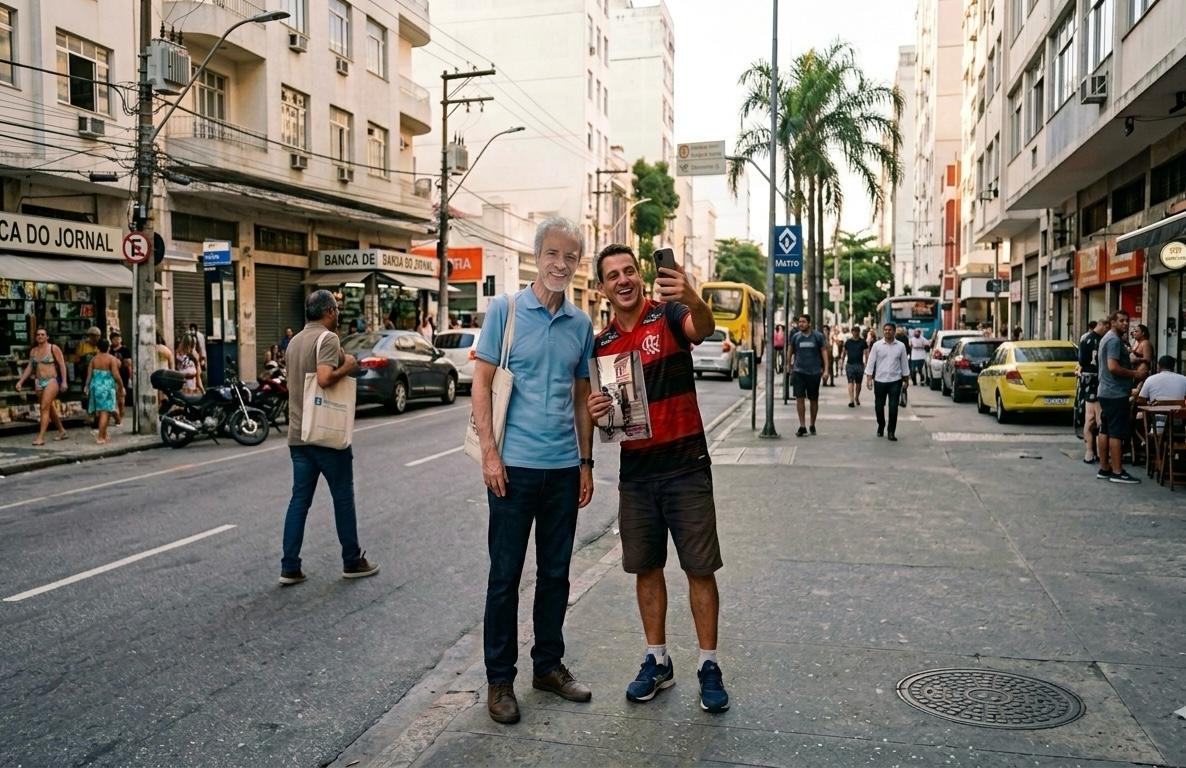 Obviamente que disse sim e tratei de mostrar o meu melhor ângulo, caso ele realmente exista. Não queria que a captação daquele momento, que espero ficar para a posteridade, tenha me pegado de olhos fechados, boca torta ou… feio. Será? Quanta bobagem! O que importa mesmo é o texto que fica. Essa é a vantagem de ser escritor. Ninguém liga se você não tenha o rosto do Alain Delon ou do Tarcísio Meira.