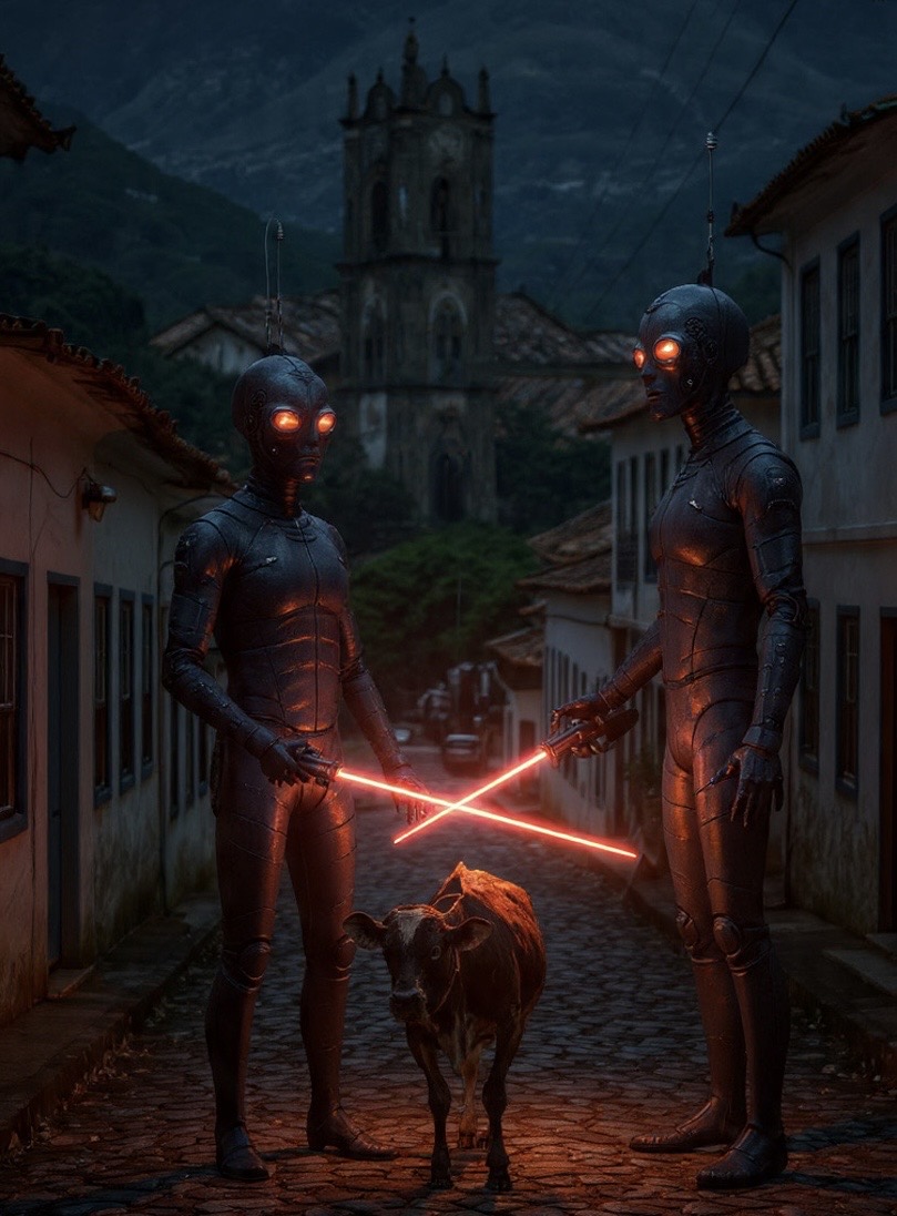 — Mas num era coisa assim tão normal, dotô! Os cabra tinha quase três metro de altura, uniforme com luzinhas, antenas piscando na cabeça e usava umas pistolas de luiz que cortava a vaca como se ela fosse mantega.