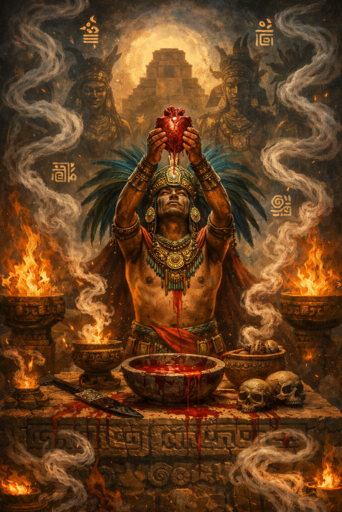 Os deuses maias não eram entidades distantes. Habitavam o milho, o vento, a chuva e o sangue. Para dialogar com eles, era preciso oferecer algo vivo, pulsante, carregado de k’uh, a energia sagrada que sustentava o cosmos. O sangue humano, sobretudo o de reis, sacerdotes e guerreiros, era visto como a seiva mais poderosa, capaz de abrir portais entre os mundos.