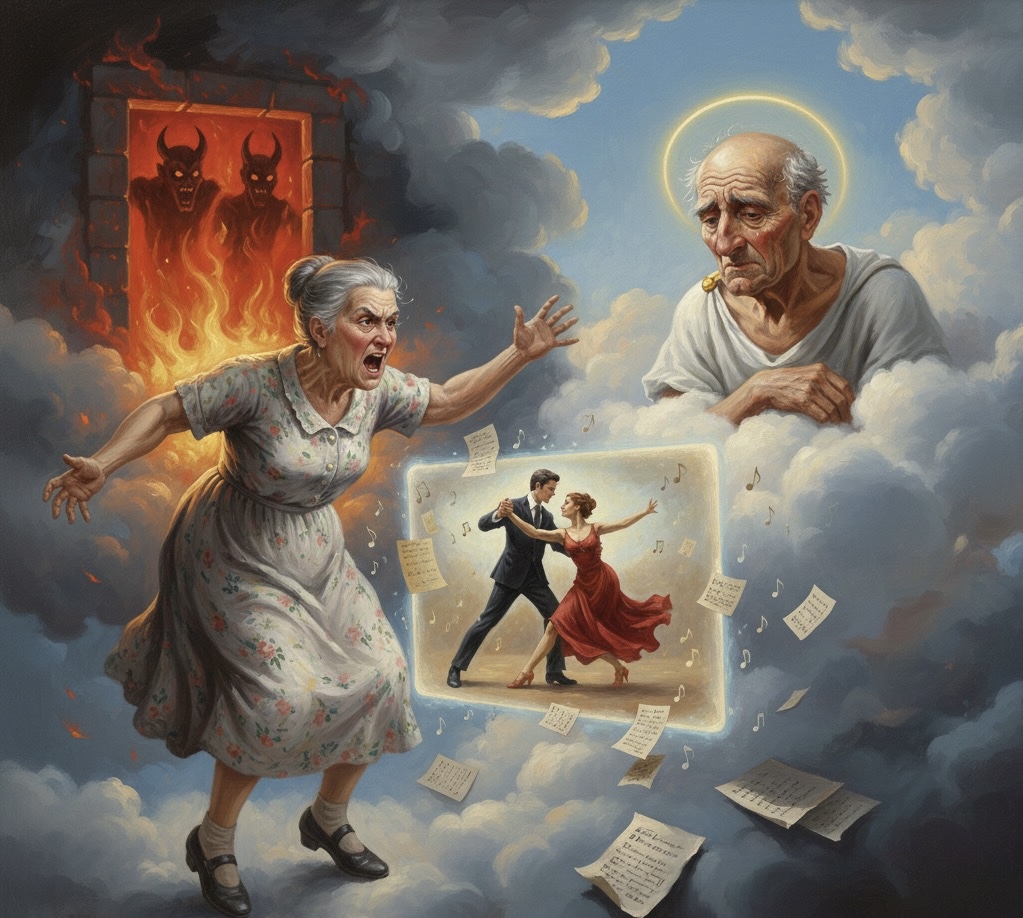 Dessa vez Geraldo se encheu de indignação. Não tinha culpa de gostar de tangos, de gostar de escrever contos, de a Argentina ser a pátria do tango, de ter tido uma namorada daqueles pagos. Ligou pra Greta e soltou os cachorros. Ela soltou de volta. Os dois velhinhos ficaram se xingando, espumando de ódio, até que o coração não resistiu e bateram as botas quase no mesmo momento.