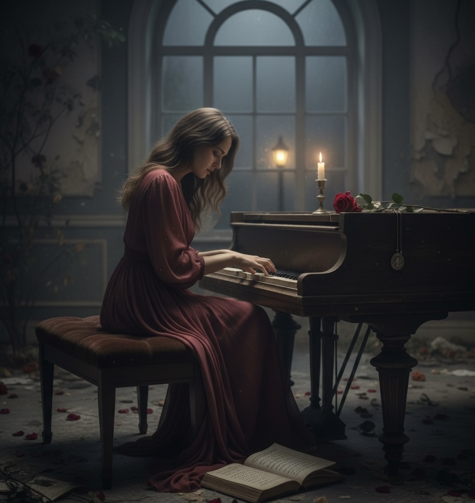 De um piano que chora na penumbra.